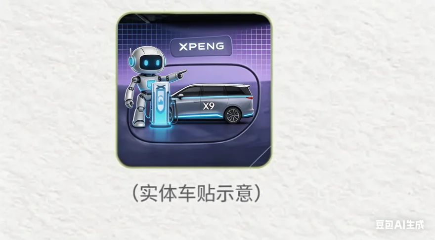 本车贴以「智电共生,方寸见未来」为核心,精准贴合小鹏品牌科技基因,聚焦X9旗舰MPV、小P机器人与超充生态三大核心符号,适配车身油箱盖区域,兼顾美观与品牌辨识度。