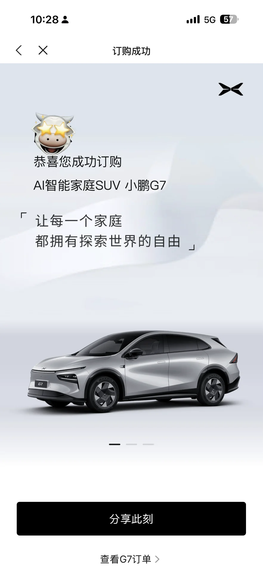 和小鹏的缘分从去年m03开始,去年的3月份提的m03,今年同样的时间提了G7。老公说小鹏的车闭眼入,我们原计划是去看G6的,后来到店试了G7,果断换了G7。遗憾的是预算有限没有➕芯片,如果预算充足还是建议加上。
