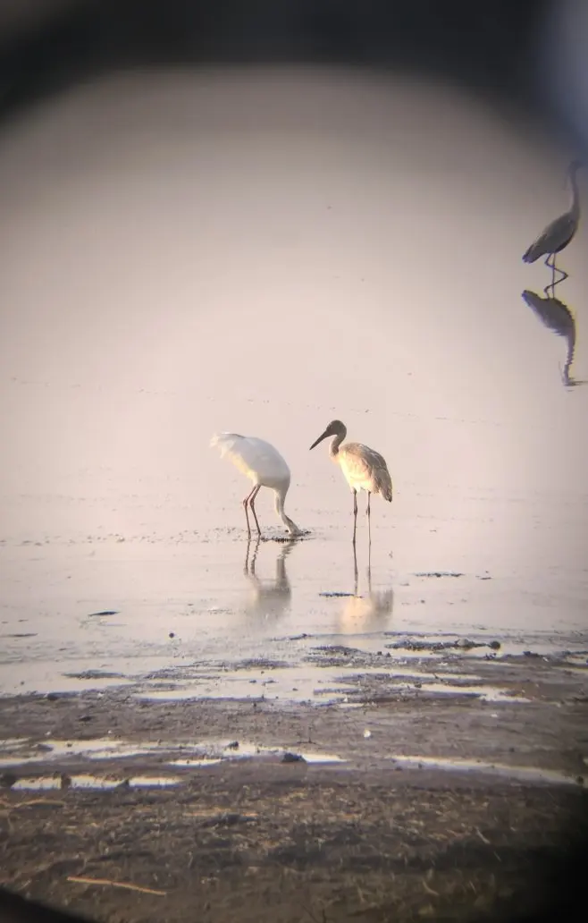 因为个子低,观鸟台的望远镜你够不到。我拿着手机对着望远镜给你拍下了一只鸟为另外一只鸟从浅滩里找东西吃的照片。你傻笑着对我说,这一定是鸟爸爸和他的鸟宝宝。