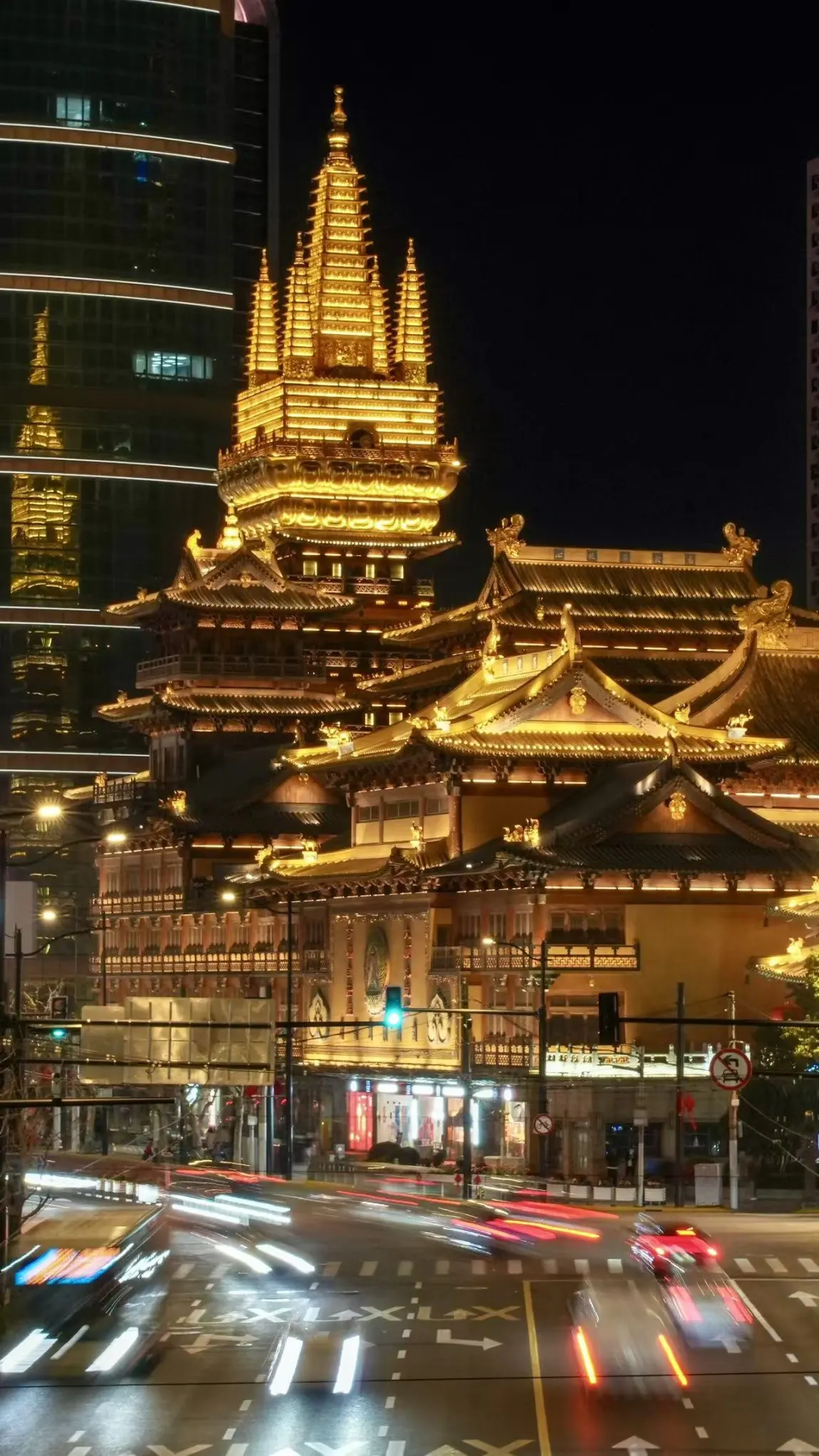 霓虹与飞檐同框,夜色里静安寺的鎏金塔顶撞碎在现代高楼间,小鹏车灯的光带像春日的温柔笔触,给城市夜景镀上暖光。