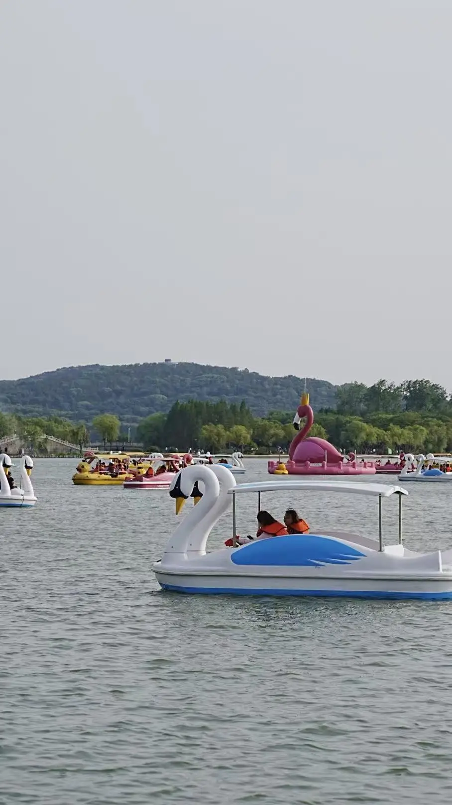 湖面漾开层层涟漪,天鹅船载着惬意缓缓前行,远处粉色火烈鸟装置添了几分童趣,这是春天独有的松弛感。