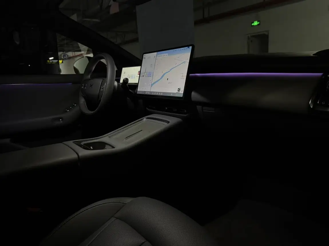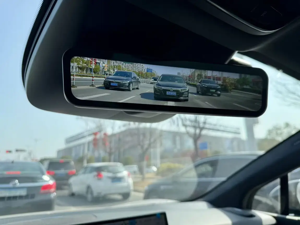 静谧的车内时光,紫色氛围灯暖而柔和,流媒体后视镜清晰框住沿途车流,科技与春日温柔相融,旅途安心又惬意。