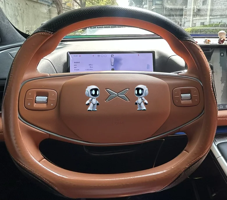 从品牌视觉逻辑来看,小鹏X标是车辆核心身份标识,象征“突破边界、探索科技无人区”的品牌精神,如同鹏鸟展翅承载着智能出行的愿景,而小P作为小鹏标志性智能交互形象,是品牌“智能情感伴侣”属性的具象载体,它区别于传统车载助手,以全场景语音交互、主动智能服务为核心,贯穿用户每一次出行体验,将两只小P对称排布于X标两侧,让品牌标识与IP形象深度融合,既强化了视觉辨识度,让每一次握盘都能直观触达品牌记忆,又通过小P“面对面朝向X标”的设计,形成视觉聚焦点,让原本简约的方向盘更具层次感与专属感,契合小鹏年轻化、科技感的品牌调性。