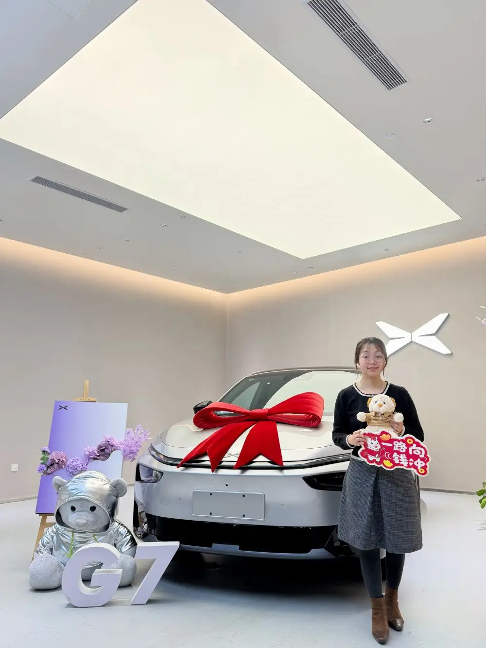 一走进交付中心,就被满满的温馨氛围包围了——我的银色小鹏G7静静停在中央,车头系着超大的红色蝴蝶结,旁边摆着可爱的银色宇航服小熊和“一路向钱冲”的手举牌,连背景墙都点缀着温柔的紫花,仪式感直接拉满💖
