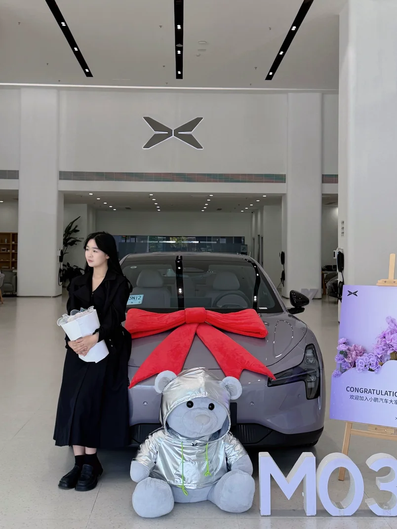 最让我惊喜的是,交付专员不仅帮忙拍照,还特意指导我们摆姿势,找角度,拍出来的照片张张都是大片!他们还准备了“欢迎加入小鹏大家庭”的立牌和小熊,整个交车区布置得温馨又喜庆。