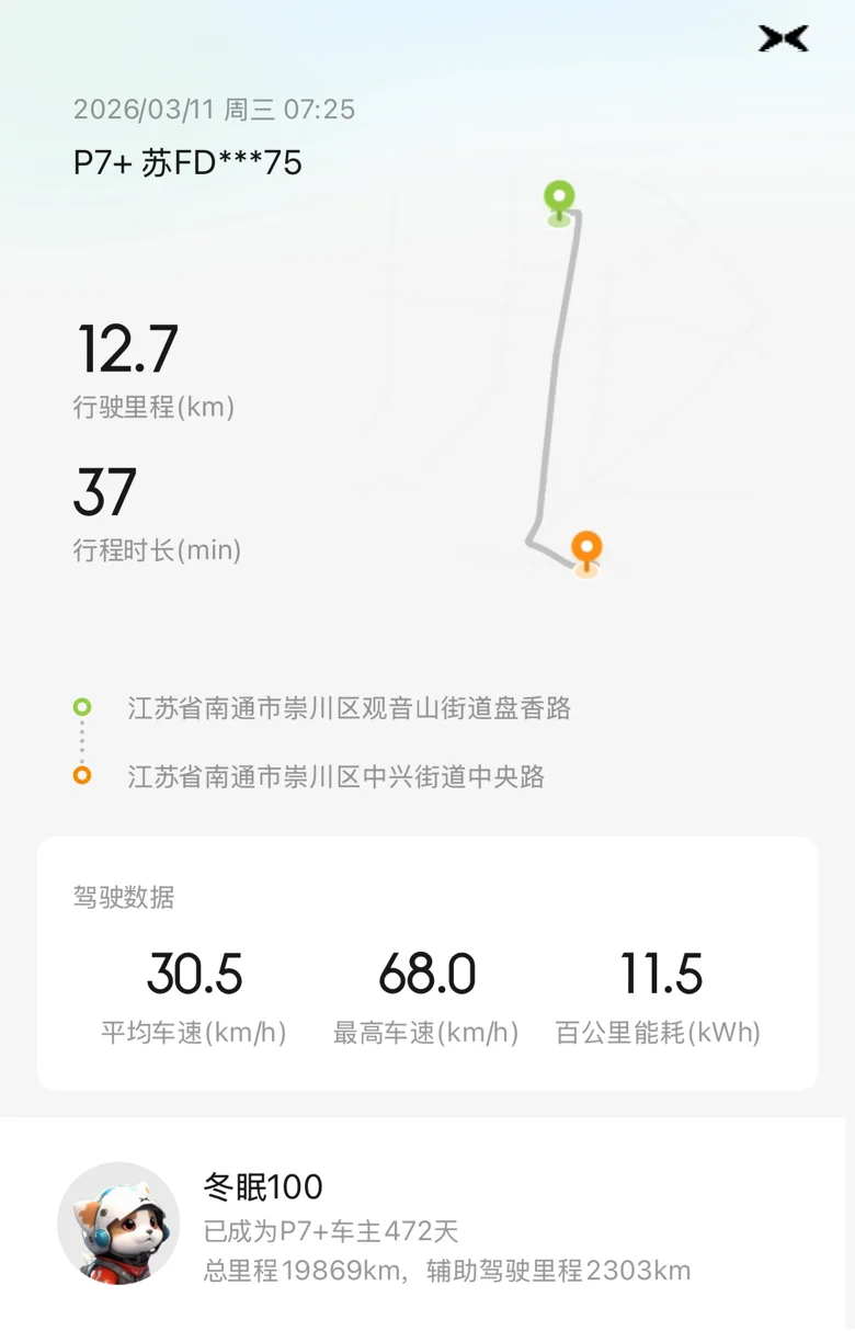 #能耗报告# 春日通勤能耗成绩单来啦📊开着我的小鹏P7+,今天从家到公司,12.7km的路程跑出了11.5kWh/100km的能耗!分享几个我的省电小技巧:• 尽量用城市NGP辅助驾驶,平稳加减速比自己踩更省电• 春天温度适宜,把空调调到24℃自动模式,避免大功率制冷制热• 保持经济时速在60-70km/h,风阻和电耗都能控制得很好作为472天的小鹏P7+车主,总里程快2万km了,辅助驾驶不仅省心还能帮我精准控能耗,低碳出行真的很有范儿~