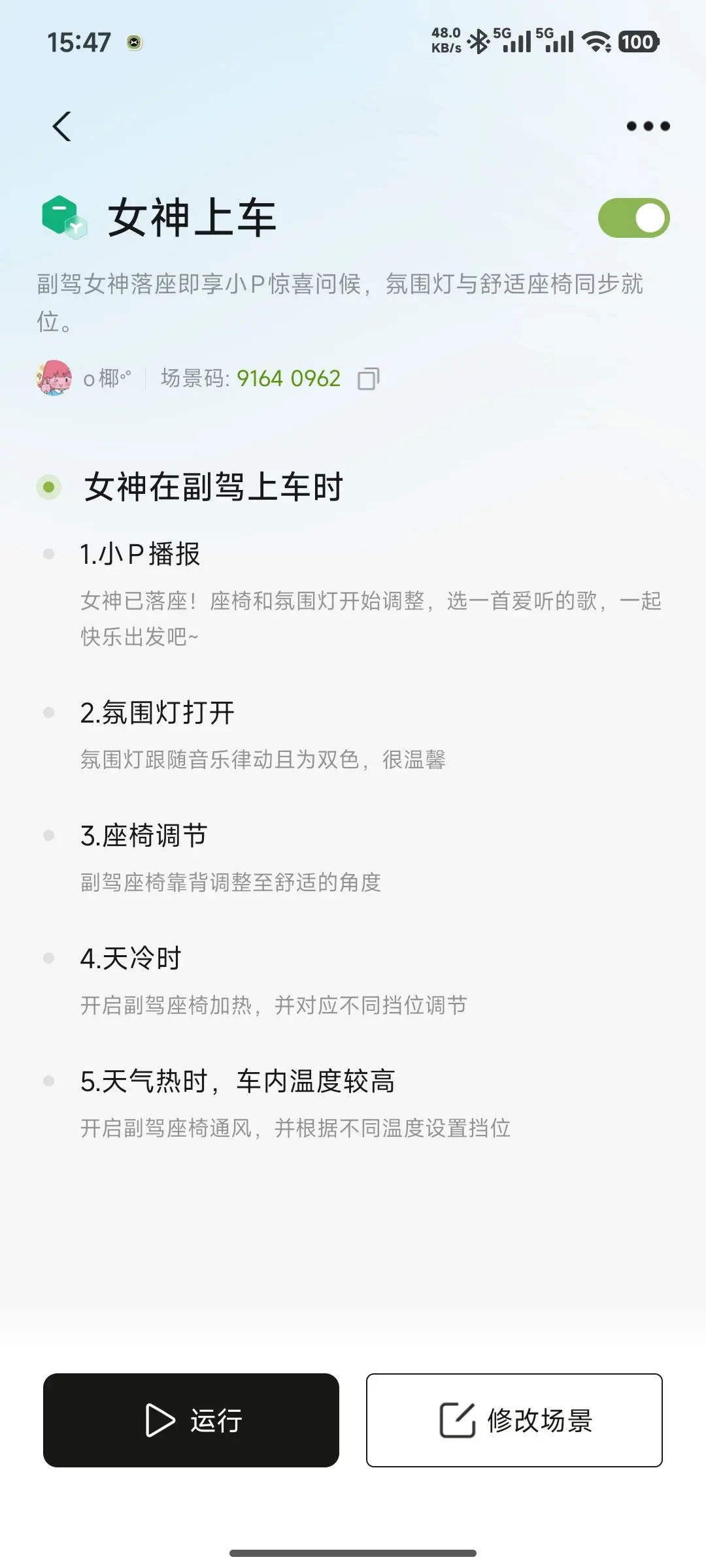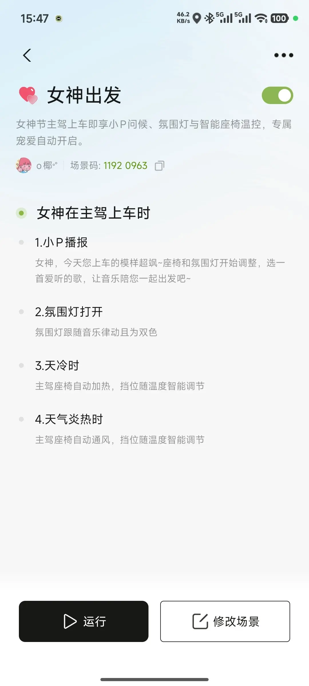 在女神节期间,为我的小p设置了两个很有仪式感的相关智慧场景,我和副驾上车时都会播报,朋友坐我的车都表示仪式感满满的
