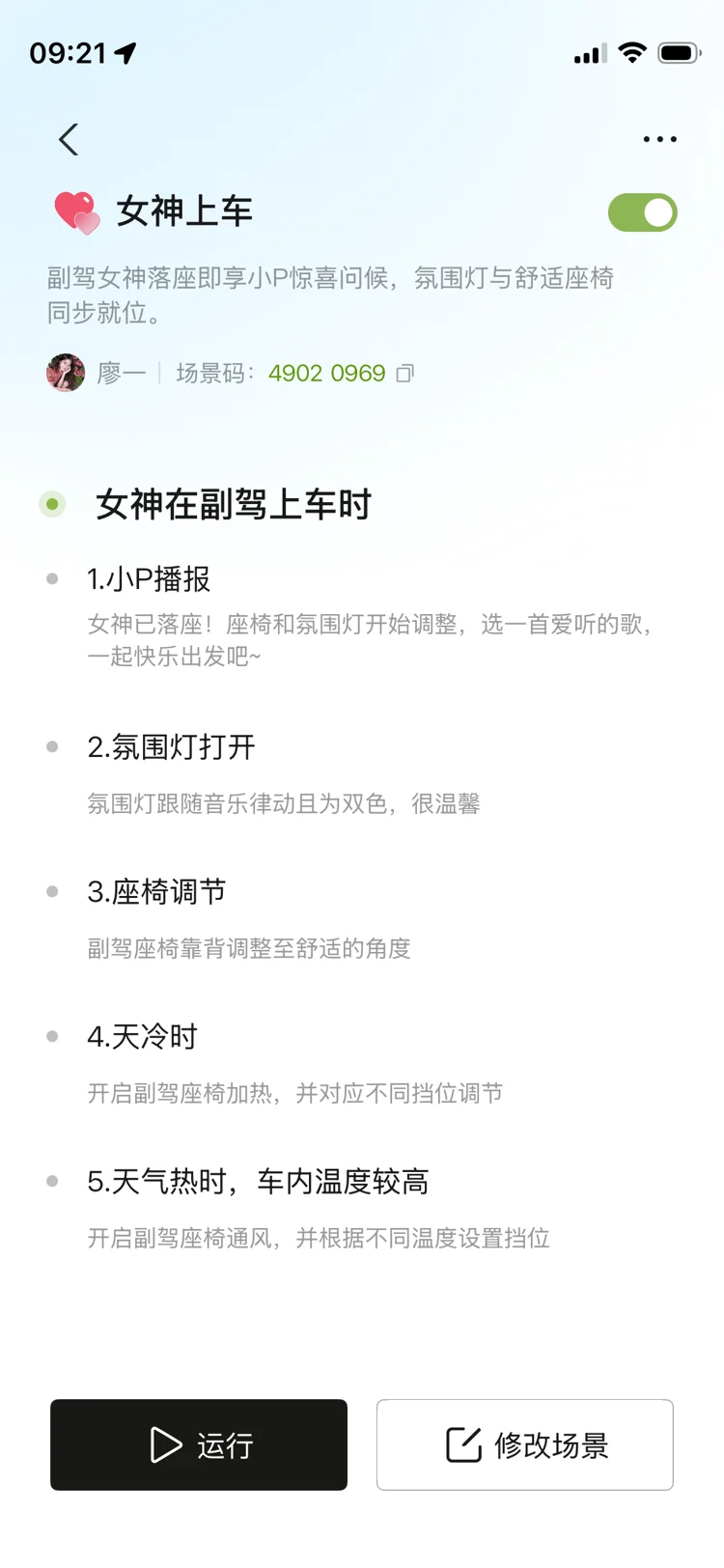 女神节小p专属问候,有氛围灯还有座椅调节,还另外设置了温度调控。