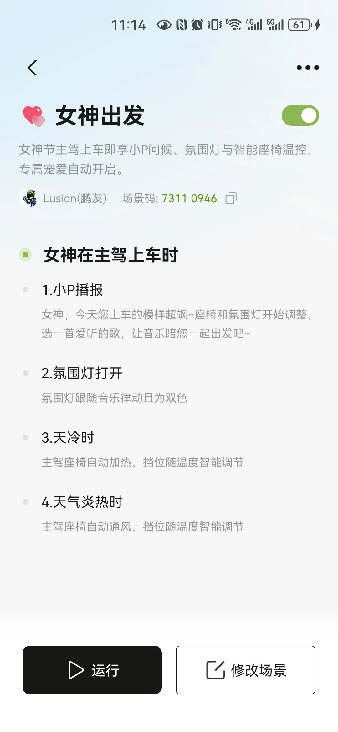 #玩转智慧场景# ✨小鹏「女神出发」场景解锁指南 输入场景码7311 0946,一键get女神节专属宠爱!主驾上车即享小P暖心播报,双色氛围灯随音乐律动,冷暖天自动适配座椅加热/通风,把仪式感拉满~让每一次出发都被温柔包裹,做自己的闪耀女神! #小鹏汽车 #女神节仪式感 #智能出行