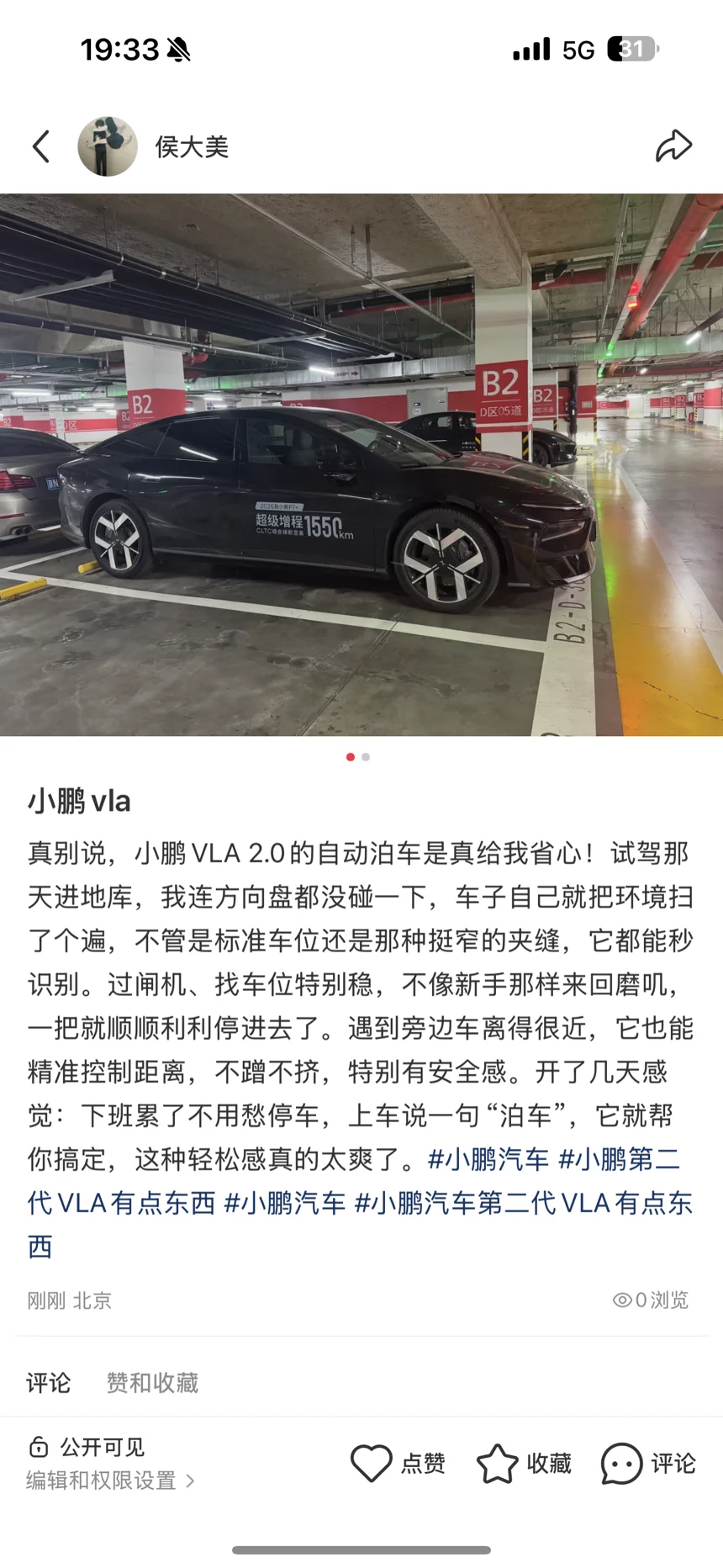 真别说,小鹏VLA 2.0的自动泊车是真给我省心!试驾那天进地库,我连方向盘都没碰一下,车子自己就把环境扫了个遍,不管是标准车位还是那种挺窄的夹缝,它都能秒识别。过闸机、找车位特别稳,不像新手那样来回磨叽,一把就顺顺利利停进去了。遇到旁边车离得很近,它也能精准控制距离,不蹭不挤,特别有安全感。开了几天感觉:下班累了不用愁停车,上车说一句“泊车”,它就帮你搞定,这种轻松感真的太爽了。