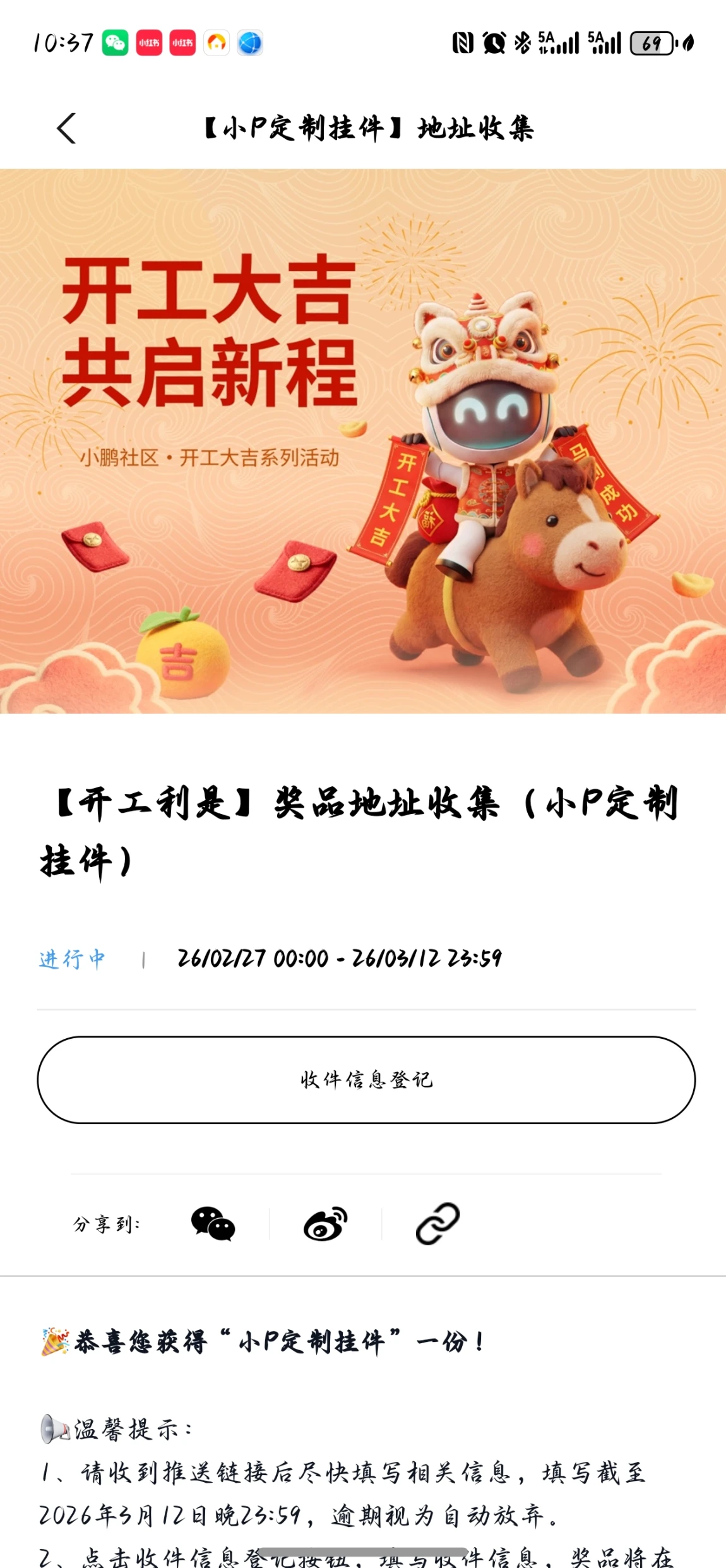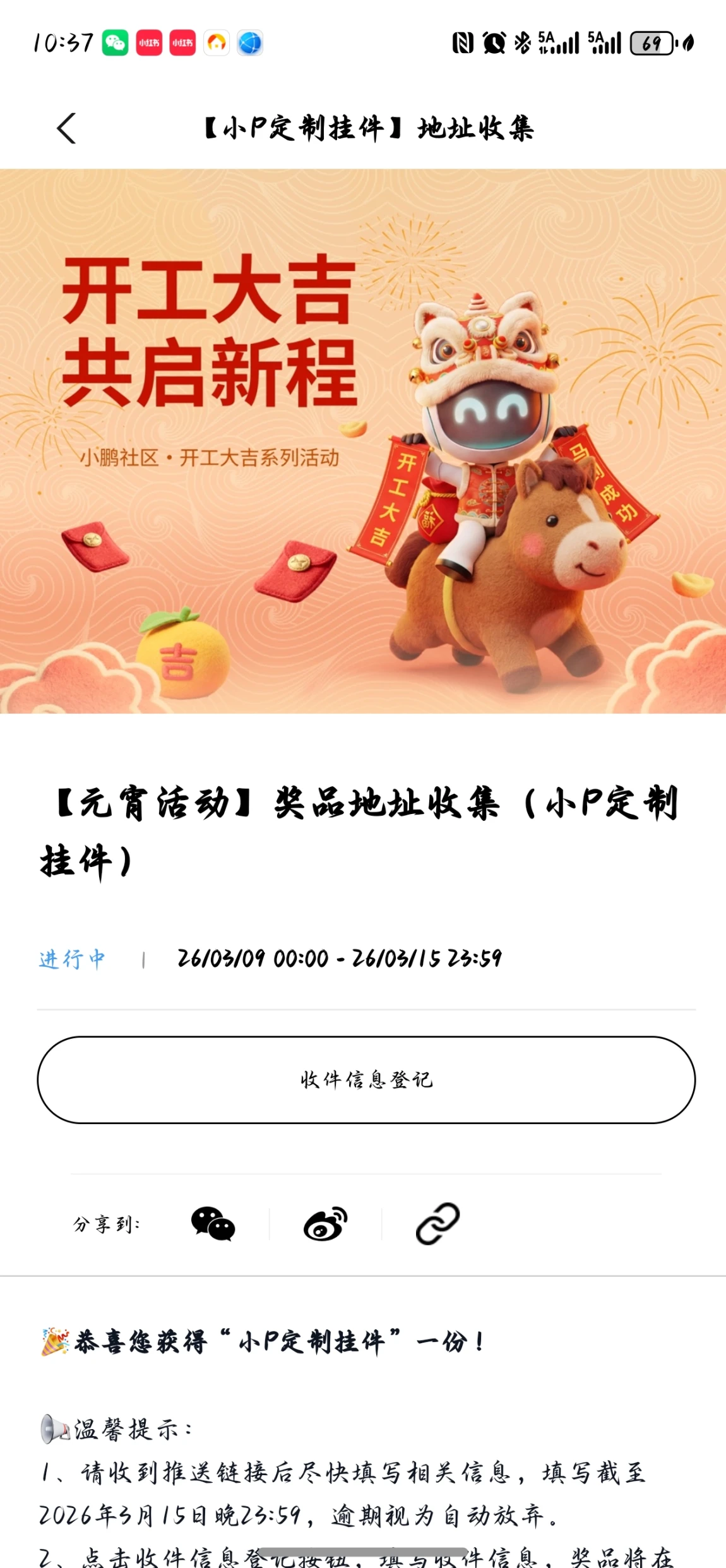 🧧 开工&元宵限定小P挂件:两个活动都中了!马年小P挂件还在派送中,满心期待这份可爱惊喜快快到家~🎊~