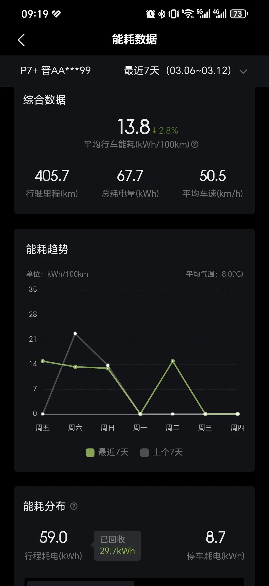 🔋总耗电:67.7kWh(含停车耗电29.7kWh)