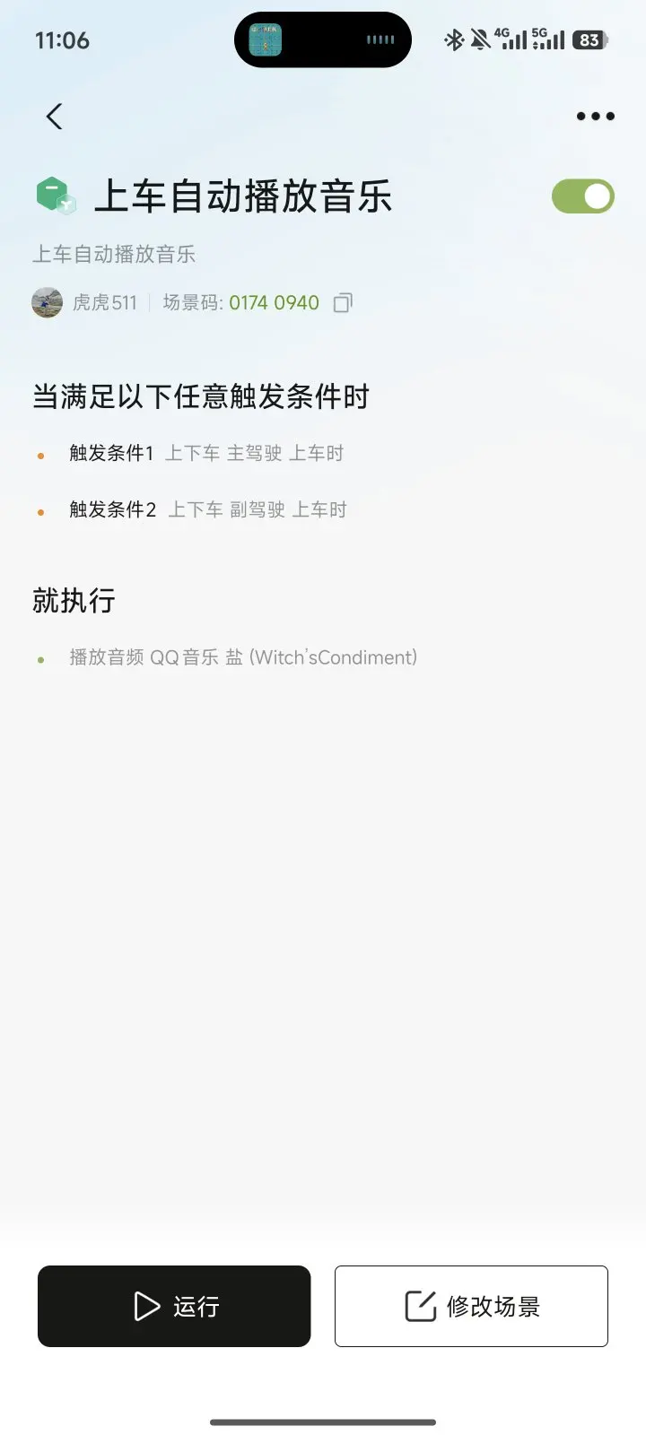 场景码:01740940;主、副驾上车后,自动播放沈以诚的《盐》。