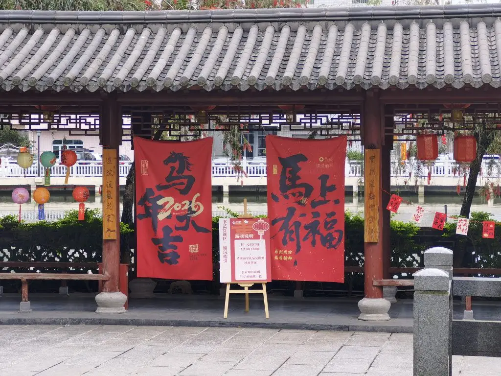 - 古色古香的亭台里挂满了马年祝福,红绸子飘着,灯笼晃着,仿佛穿越回了几百年前的热闹市集。