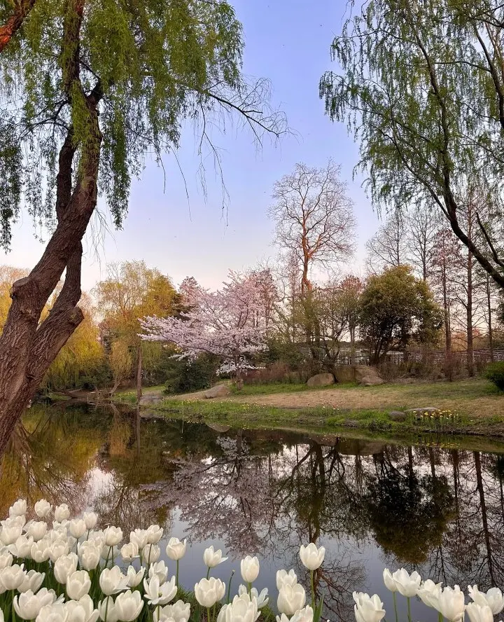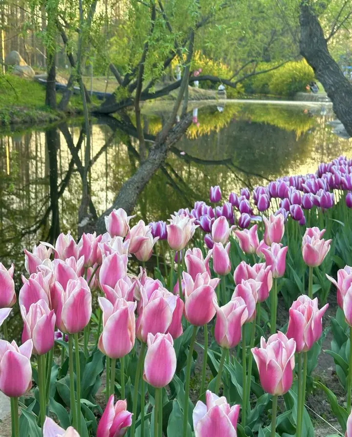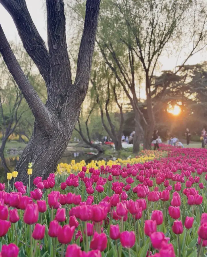 ①樱花岛的晚樱吹雪隧道🌸+油菜花田的金色波浪🌼(近3号门大草坪)+喷泉旁的郁金香彩虹带🌷