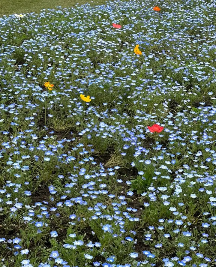隐藏玩法:虞美人混着二月兰开成彩色地毯,躺在花丛里仰拍,自带柔光滤镜!