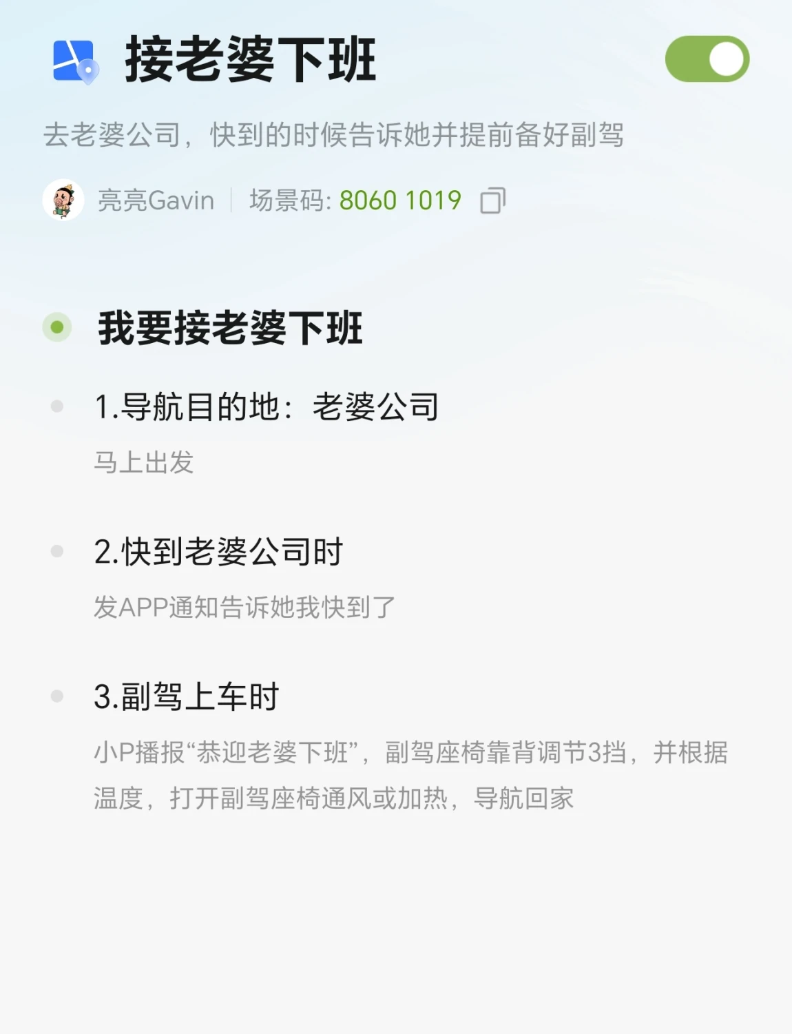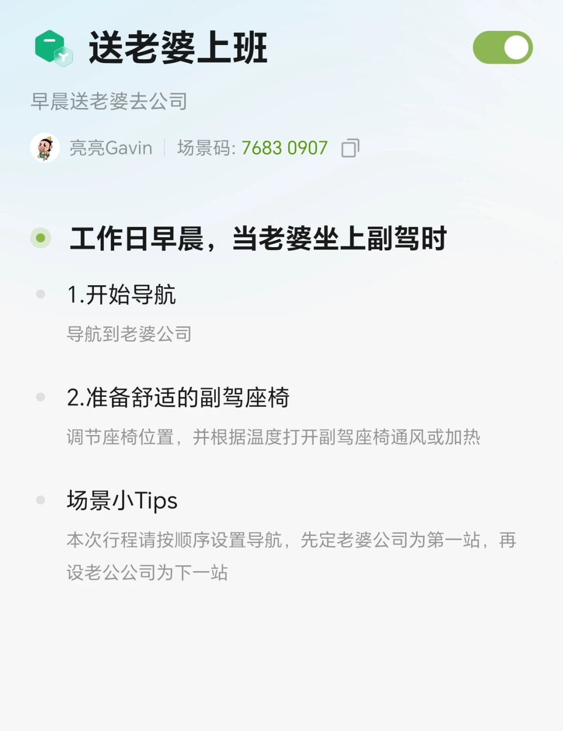 工作日清晨,老婆坐上副驾,「送老婆上班」场景自动触发,一键导航直达她的公司,座椅自动调到她习惯的角度,天冷开加热、天热开通风,通勤路上全是不动声色的体贴。