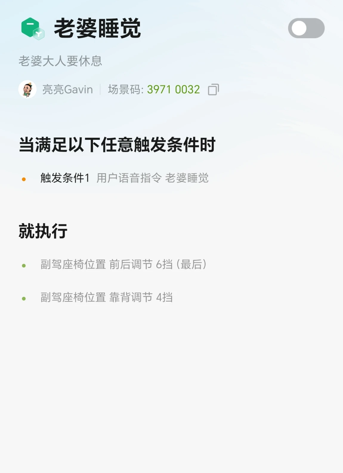 长途出行她想小憩,一句“老婆睡觉”,「老婆睡觉」场景立刻响应,副驾座椅自动调至躺卧角度,给她专属的静谧休憩空间。