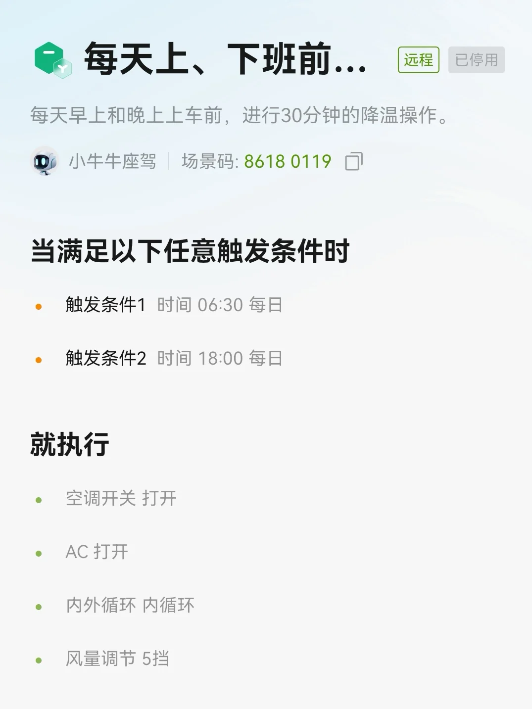 - 上下班前自动空调:我设置了每天06:30和18:00提前30分钟开启空调,打开AC、内循环并调至5挡风量。无论是清晨赶班还是傍晚下班,拉开车门就是最舒适的温度,再也不用忍受暴晒后的闷热或清晨的凉意,通勤幸福感直接拉满。