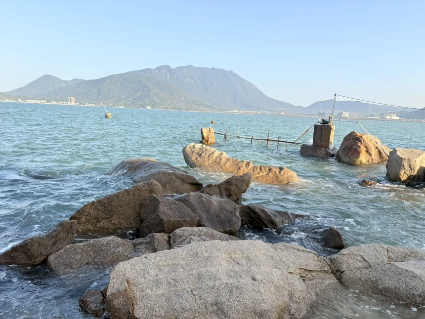 春日的海边有一些微风,海浪轻轻拍打岸边礁石,海鸥掠过海面,阳光洒下海面。
