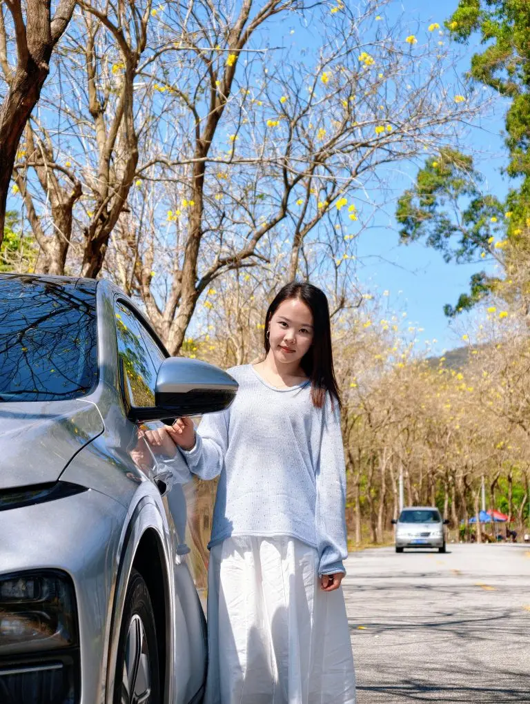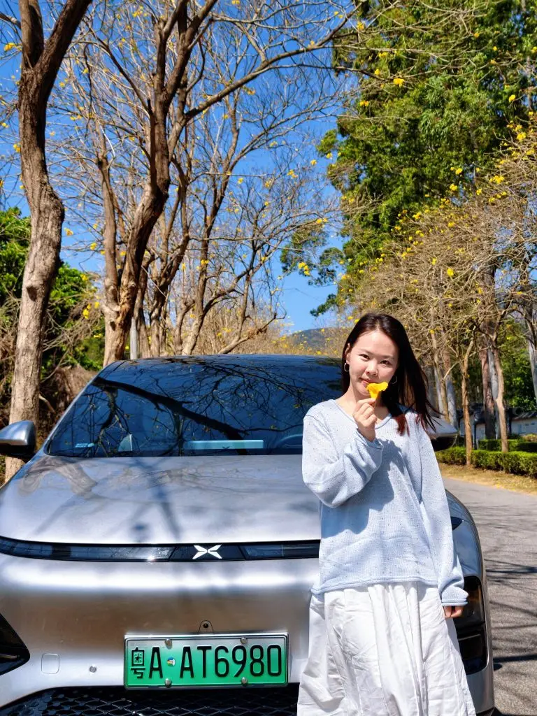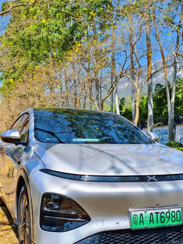 ——前景虚化车头特写:拍车头的时候,用头顶的花枝和黄花做前景,轻微虚化前景,聚焦车身的星环灯带与小鹏标,阳光落在车身上的斑驳树影,瞬间拉满春日氛围感,还能完美避开人群,画面干净又高级。