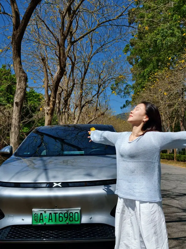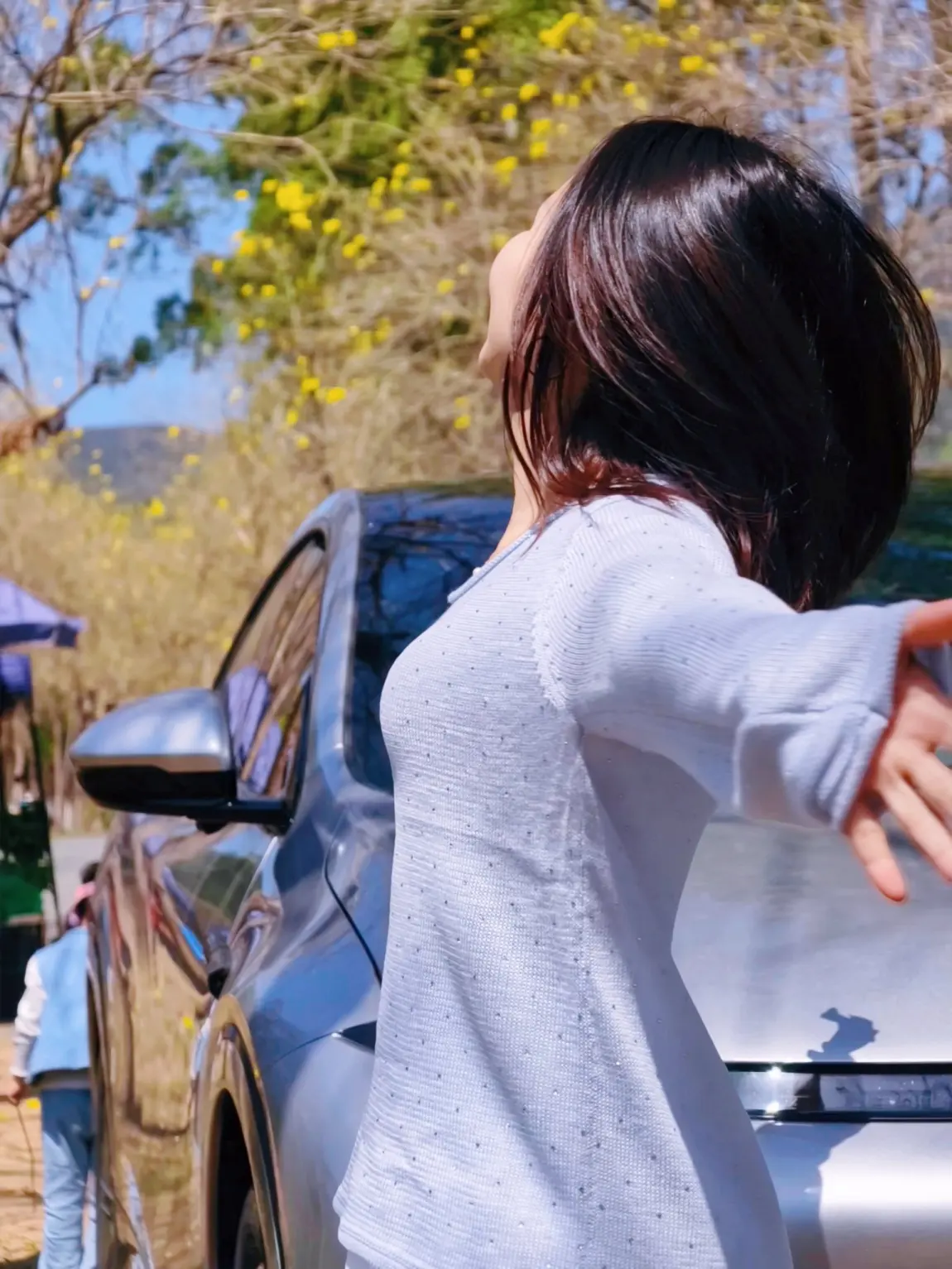 ——低角度仰拍:把机位放低仰拍,人物张开手臂拥抱春风,把蓝天、满枝黄花、小鹏G6都收进画面,完美避开地面的杂乱,画面干净又有张力,满满的春日松弛感直接溢出屏幕。