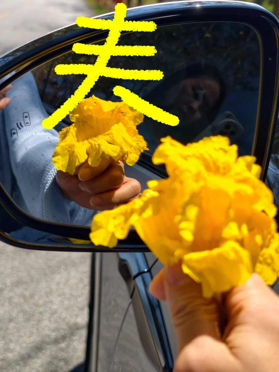 ——后视镜创意拍:在后视镜上用黄花拼出“春”字,拿着花对着后视镜拍,把春日繁花、自己和爱车都收进小小的镜面里,创意感拉满,绝对是朋友圈点赞神器。