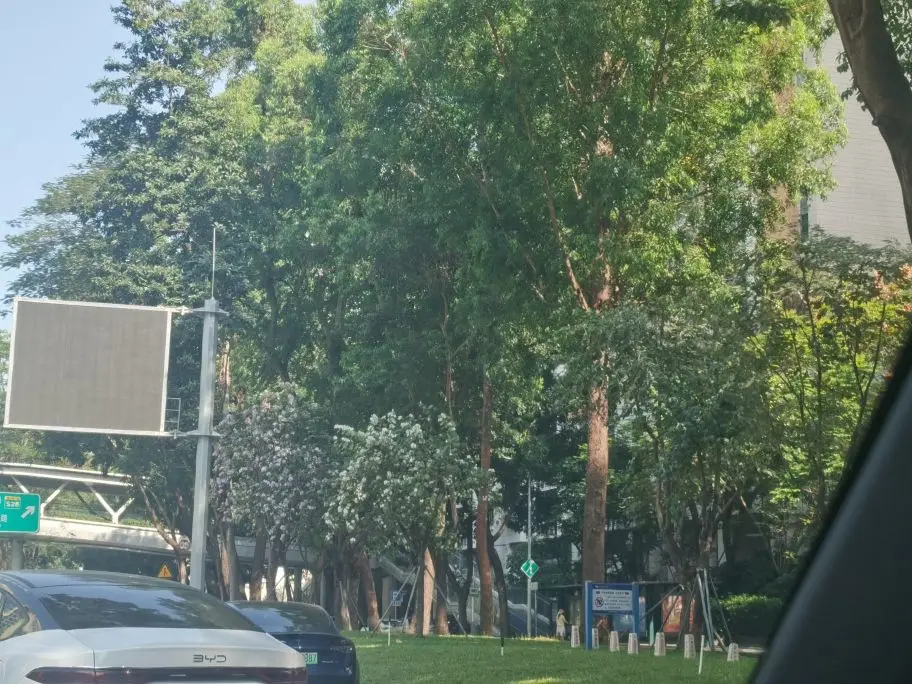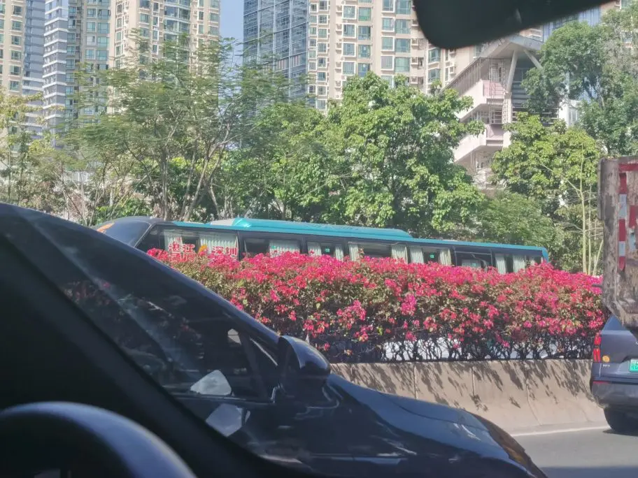 深圳果然是一个花园城市。到处都是绿化带和花草。开着小鹏的车逛城市的美。