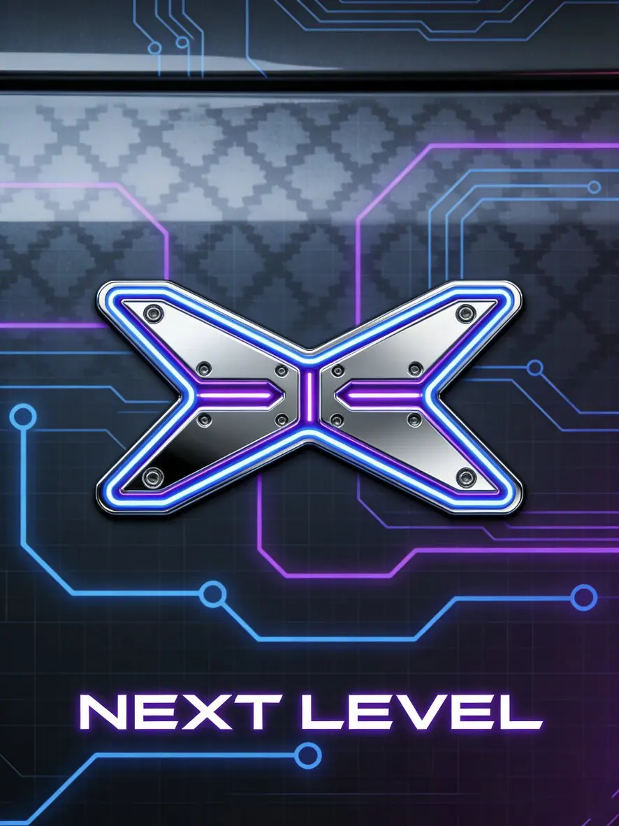 - 主体Logo:将小鹏“X”标进行金属机械解构设计,边缘融入霓虹蓝/紫的发光管线,呈现“通电”状态。