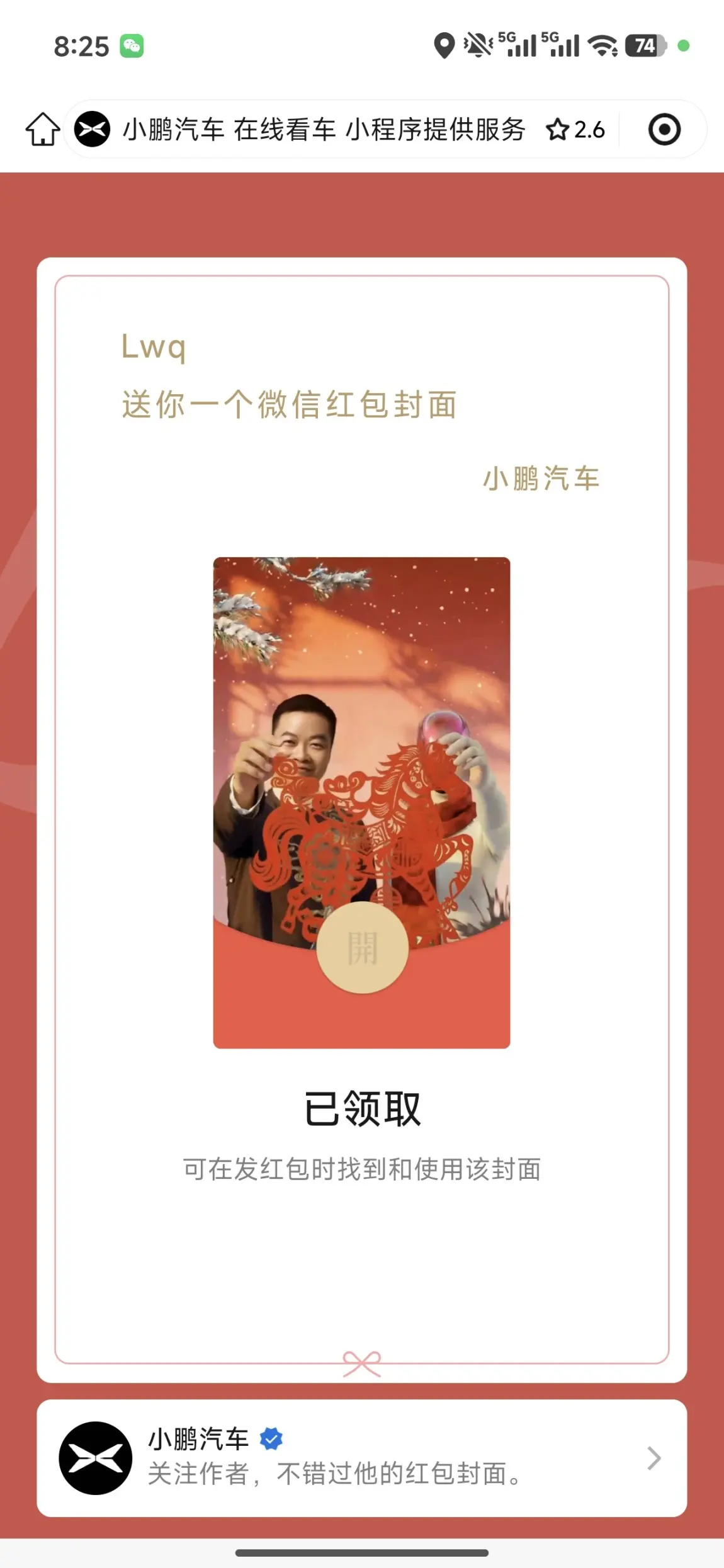 - 🧧 小鹏定制微信红包封面:属于大师兄的专属红包封面,过年发红包都有了专属排面,马年剪纸氛围感拉满!