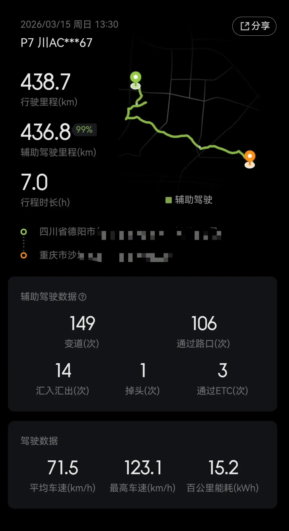 小P7续航再次震惊我。95%的电,跑完还剩9%,还能再开50公里。其中有400公里都是高速,120码开的。满载4个人(3个成年男性+1成年女性)+全程智驾+全程看综艺。有一个可能是,四川到重庆,有点下坡(海拔500米到280米)。