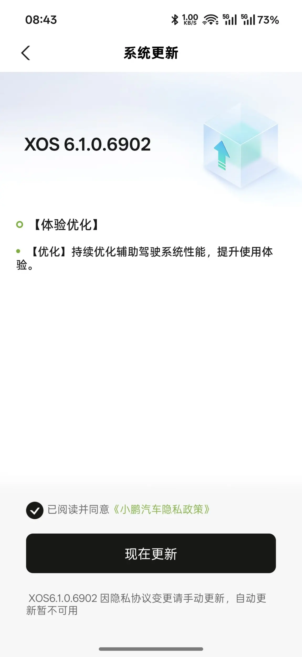 很幸运成为一名G7车主,因为买的是二手车,已经搭配第二代VLA2.0系统,今天已经推送新的更新了,可能是第一批个人车主体验,前段时间在店里试驾过,可惜时间不够充分,现在通勤体验的时间很长,2.0整体体验很丝滑,跟以往智驾对比最明显的个人感受就是,停车刹停很线性,毫无紧急刹车的感觉,刹车不点头,因为自己也是M03车主,尤其是在遇到旁车插队已经红绿灯刹车,比我自己刹车都稳。在一周的体验中也遇到一些逻辑问题,在匝道以及没车的时候,车道居中偏右,给人一种压迫感,很贴边。2.我们这边车机地图识别正确的车道线,但是导航左转弯在直行道左转,主动干预了。3.在网约车停车下课不能想人提前预判绕行,部分场景跟到网约车后等待一段时间选择绕行。希望后续更新优化一下。