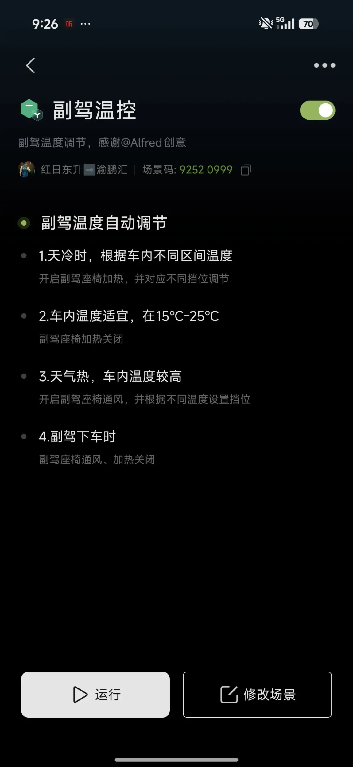 前段时间,专门为我的副驾设置了一个温控智慧场景,当天冷的时候,副驾上车以后就会自动打开座椅加热,让她感觉到我的温暖。