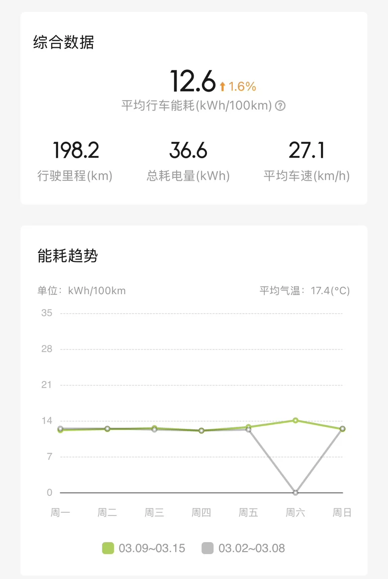 天气回暖,气温升高,小鹏的能耗表现是非常棒了,最近下雨,地面湿滑能耗略高,脚法还要再练习啊