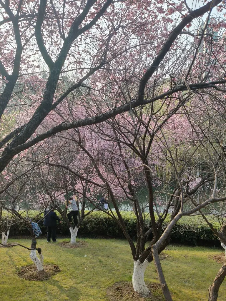在城市公园的湖边偶遇了这片早樱!粉嫩的花朵缀满枝头,和波光粼粼的湖面相映成趣。树干刷着白色保护漆,显然是精心养护的“春日使者”。最惊喜的是看到小朋友踮脚触碰花枝,连空气里都飘着童真的欢笑声~