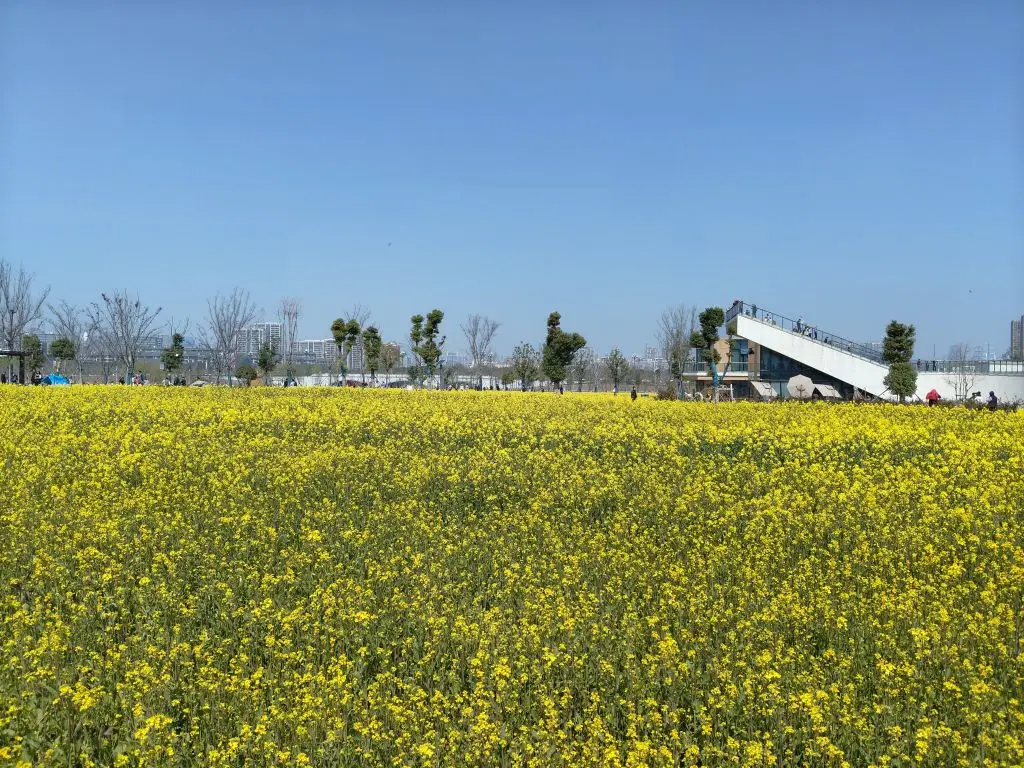 这片油菜花田就在近郊的生态公园!站在观景台俯拍,金灿灿的花浪一直铺到天边,远处还有现代建筑点缀,传统与时尚的碰撞太出片了~风一吹,花枝摇曳,连蜜蜂都在“嗡嗡”合唱春日进行曲!