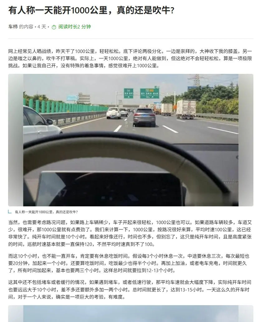 虽然算起来是7小时开了600公里,但如果真让我12小时开1000公里,我觉得真做不到。