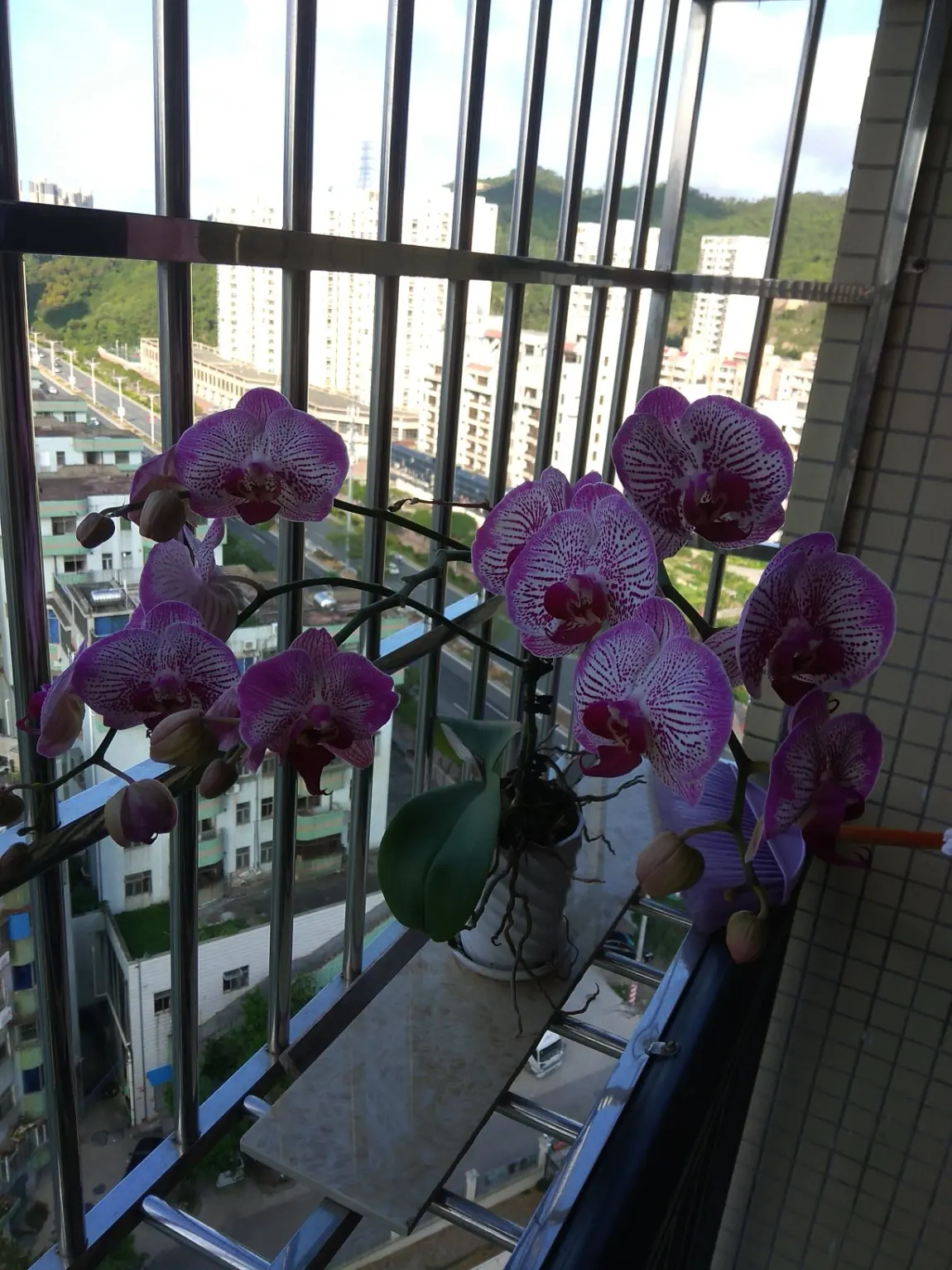 #小鹏影像记录家# 哇,这张照片里的蝴蝶兰开得太好了!紫粉色的大花瓣配上深红色的斑点,姿态优雅得像是在阳台跳舞。阳光洒在花朵上,显得特别通透,看着心情都变好了。 窗外的高楼和远处的青山绿树相映成趣,而阳台这一方小天地里,这盆盛开的兰花就是最美的风景。确实如你所说,春天的花开美如画,这大概就是生活里最简单也最治愈的瞬间吧。