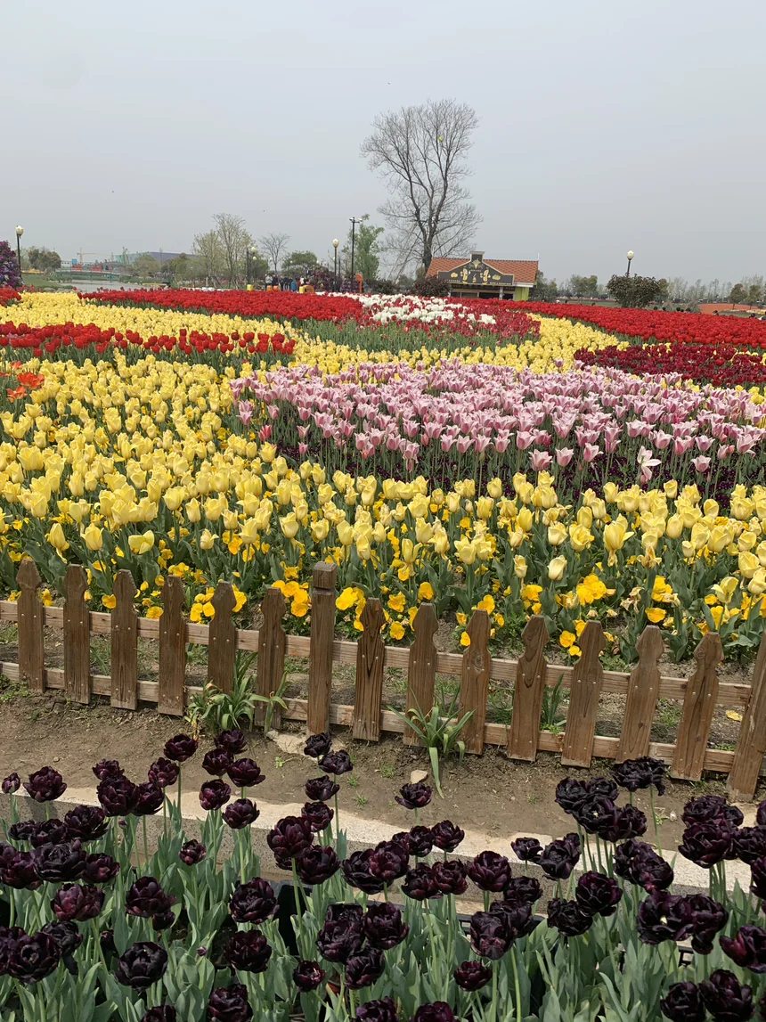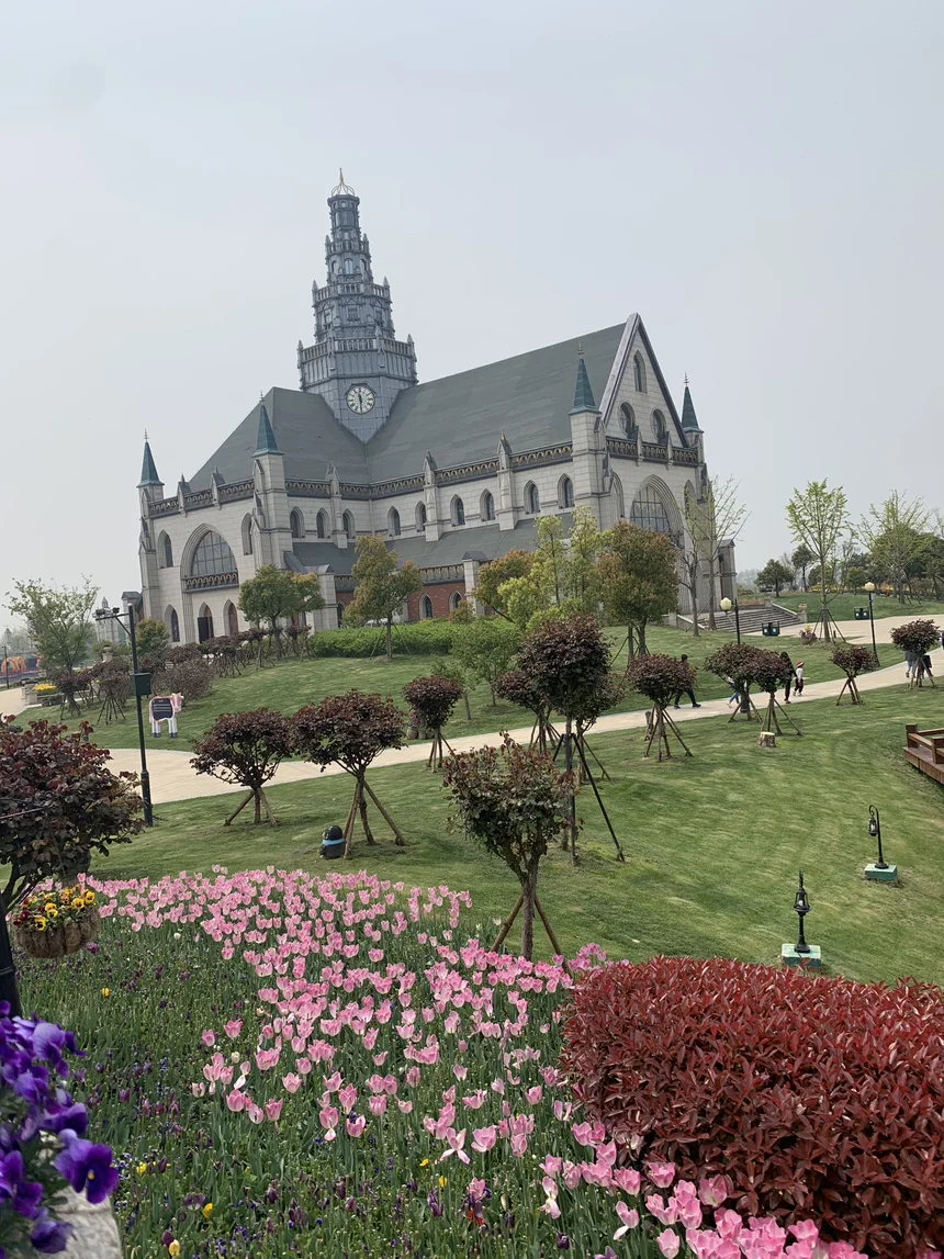 而真正的震撼,来自于那无边无际的郁金香花田。它们不是零星点缀,而是成片、成带、成海地铺展开来。近处,鹅黄与粉红交织;远处,绯红与明黄层层过渡,如打翻的调色盘,又似流动的织锦。花田之中,一条条小径将游人引向深处,远处的欧式城堡尖顶在花海的尽头勾勒出梦幻的天际线。