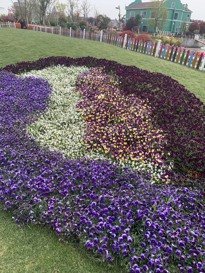 步入花海,最先感受到的是一种精心构筑的秩序与浪漫。巨大的心形花坛由明橙与深紫的花卉精准拼接,如同大地献上的最直白告白。沿着小径深入,两只硕大的黄色木鞋雕塑俏皮地立在花丛中,搭配着红、蓝、绿、黄相间的彩色栅栏,瞬间将人带入童话般的荷兰风情里。