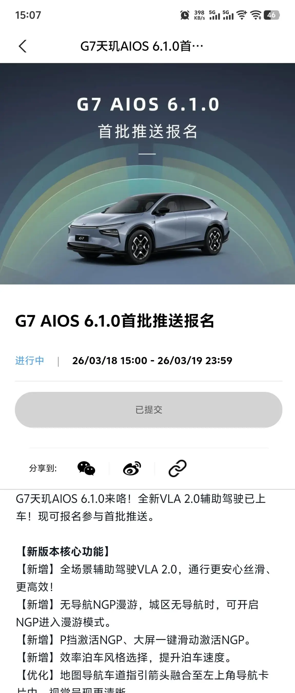 自从去年8月份买了G7之后就一直关注着Ultra版能有什么优秀的智驾表现,直到最近看了好多媒体试驾的VLA2.0,已经完全从585的可用到了好用的状态,期待升级后能惊艳到我