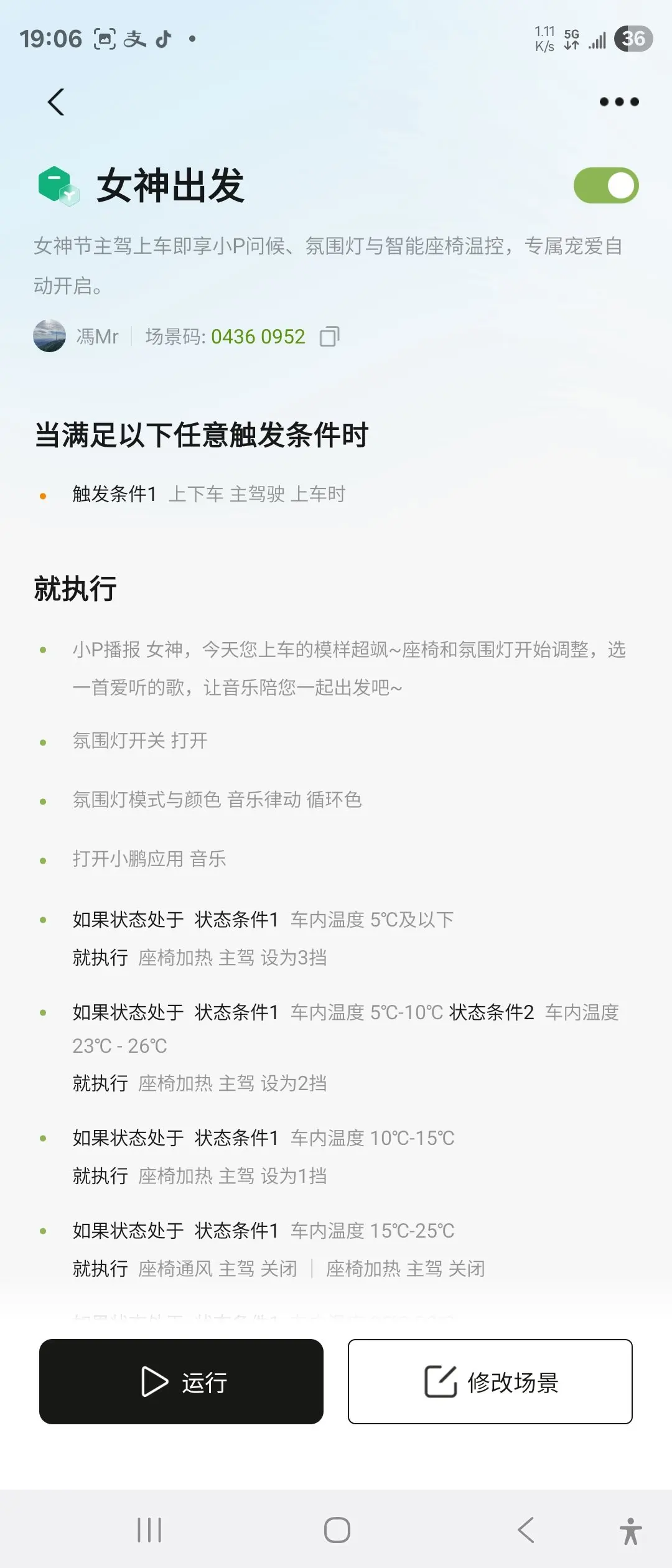 #玩转智慧场景# 场景名称:「女神的温柔时刻」触发指令:「小P,开启女神模式」场景动作: 1. 自动调节主驾座椅至半躺模式,打开座椅加热/通风2. 全景天幕调至透光模式,氛围灯切换为柔粉渐变3. 播放预设的女神节治愈歌单,音量调至30%4. 空调自动切换为24℃微风模式,香氛开启柑橘调