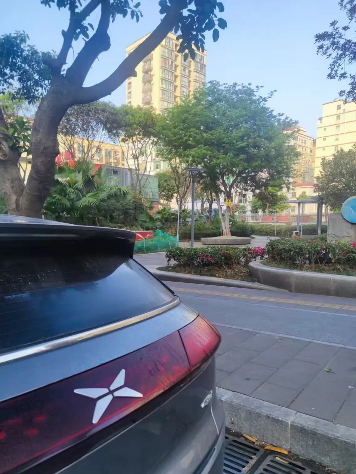 红色的尾灯与远处的红花🌸相辉映,小鹏的logo,就像蝴蝶🦋一样在花间飞舞