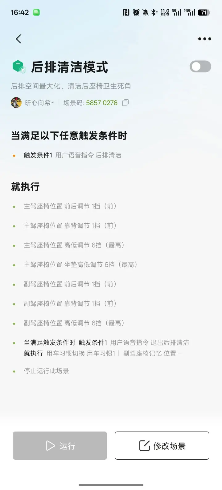 根据打扫卫生和开车的需求,设置适配的模式,不用手动调节座椅、切换模式,很方便。