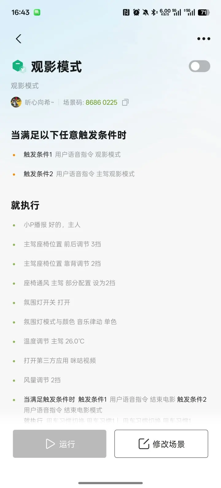 3️⃣观影模式:等人或者停车休息时,说一句“打开观影模式”,主驾座椅自动后移放倒,打开2挡通风,氛围灯调成音乐律动单色,空调调到26℃、2挡风量,同时打开咪咕视频;看完后说“结束电影模式”,座椅就自动恢复到驾驶位置,很实用。