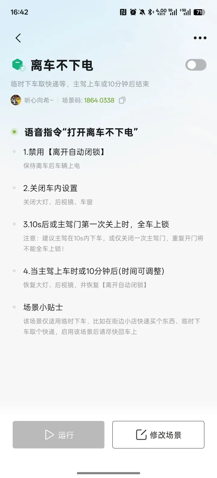 4️⃣离车不下电:平时取快递、买早餐,临时下车怕车自动锁车断电,导航、音乐就都没了。说一句“打开离车不下电”,系统会暂时关闭自动闭锁,10秒后或者关主驾门时自动落锁,同时关掉大灯、车窗;回来上车,或者10分钟后,所有设置自动恢复,不影响后续使用。