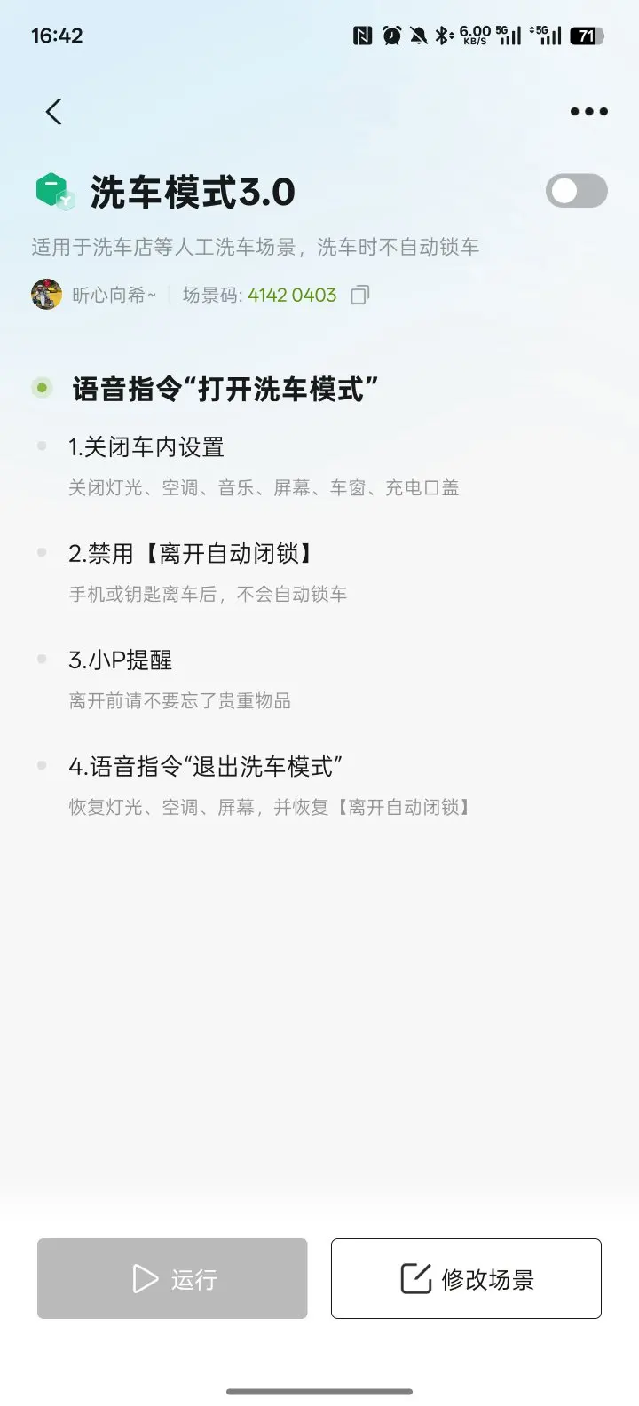 5️⃣洗车模式3.0:去洗车的时候,不用反复提醒店员别碰自动锁车、别开错功能。说一句“打开洗车模式”,就能一键关闭灯光、空调、音乐、车窗和充电口盖,同时关闭离开自动闭锁,小P还会提醒别忘了带贵重物品;洗完车说“退出洗车模式”,所有设置就都恢复了,不用多操心。
