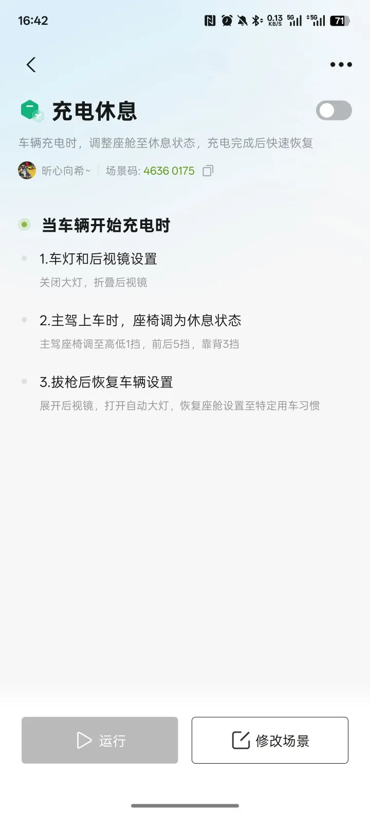 2️⃣充电休息:在快充站等充电时,插上充电枪后自动触发,关闭大灯、折叠后视镜,主驾座椅调到休息位置(高低1挡、前后5挡、靠背3挡),可以舒服地歇一会儿、看看手机;拔枪后,座椅和车辆设置自动恢复,直接开车就行。