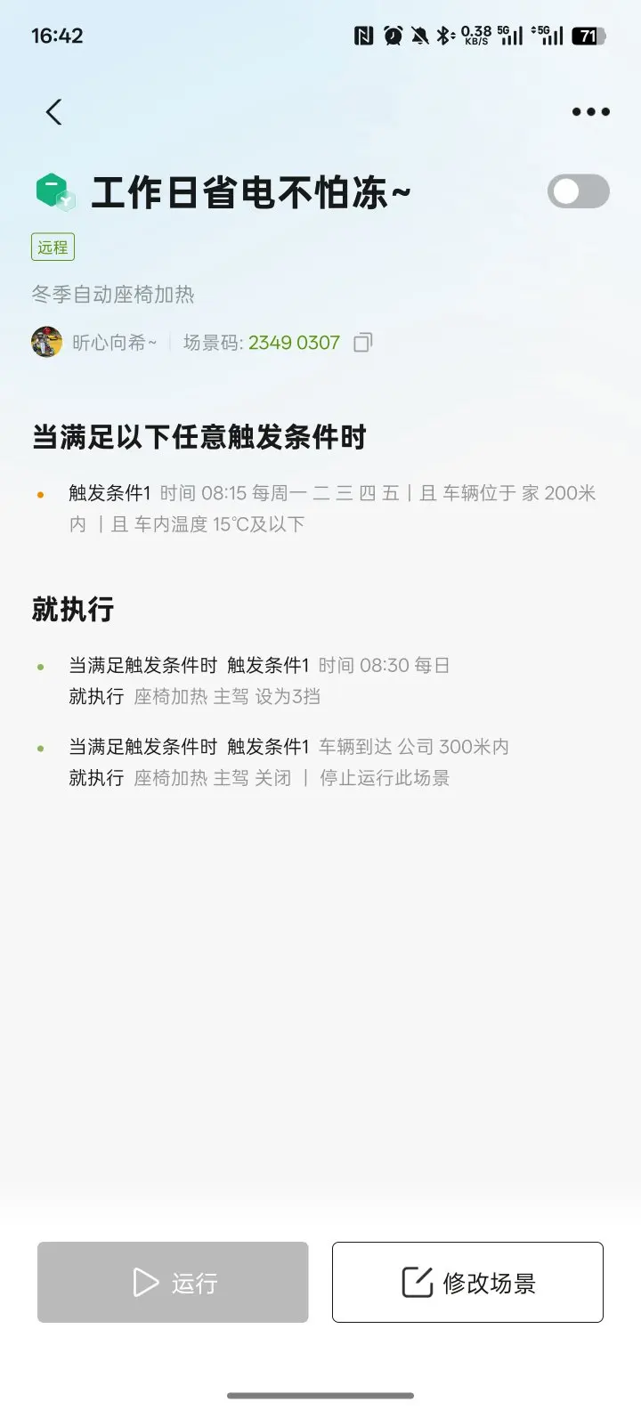 1️⃣工作日省电不怕冻:每周一到周五8:15,车辆在家200米范围内、车内温度低于等于15℃时自动触发,8:30准时打开主驾座椅加热3挡,上车就不冷;到公司300米内自动关闭加热,既省电,下车也不会觉得热,不用再在车里等空调升温。