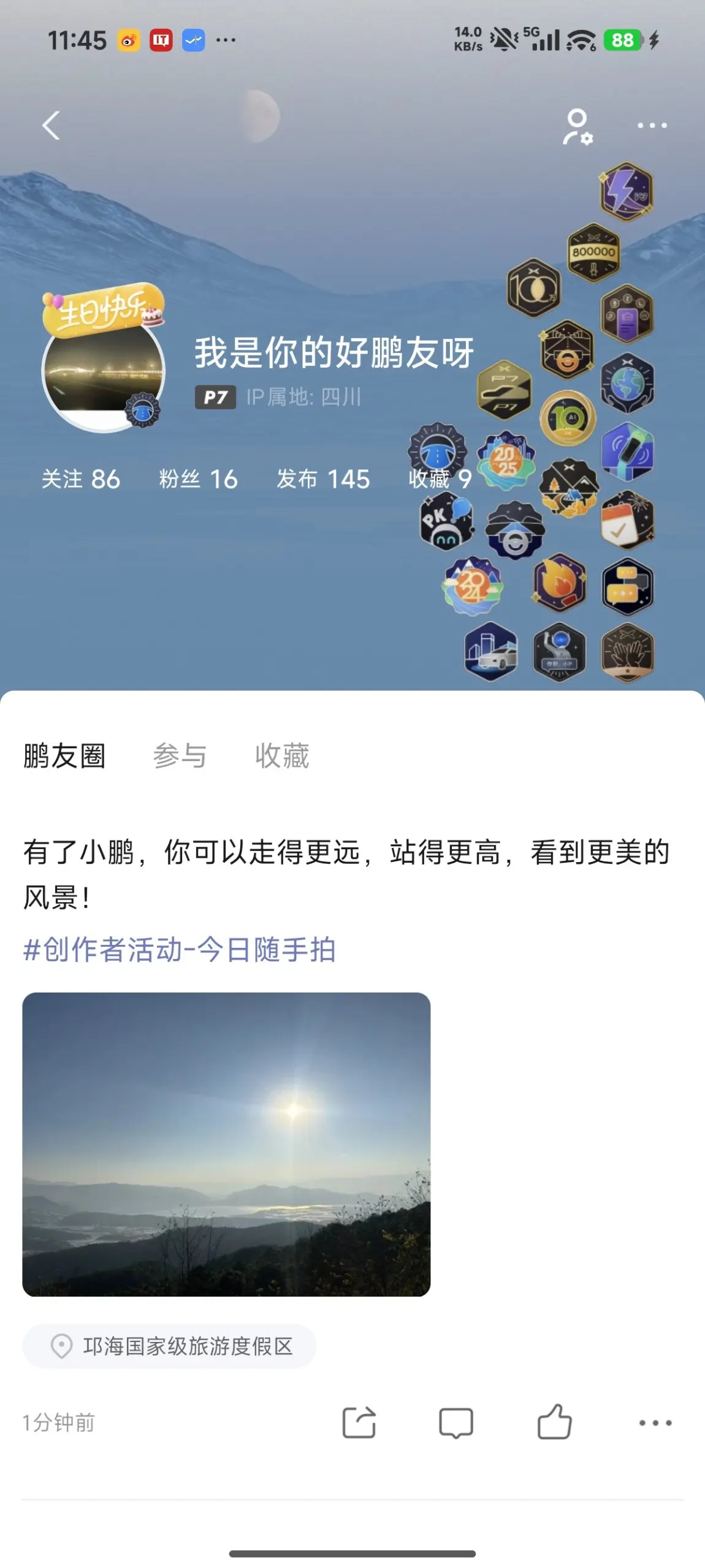 做鹏友快四年了,我以收集勋章为乐!每一个勋章都见证了小鹏陪伴我的每一天,就像是军人的军功章,在闪闪发光!我希望当我的爱车退役时,会挂满更多的勋章!